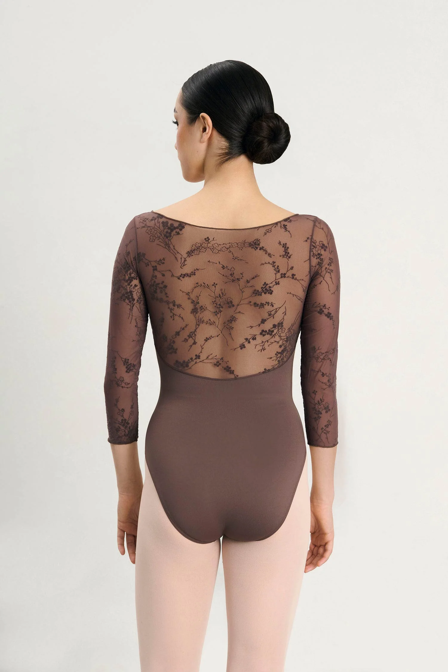 ¾ sleeve leotard with elastic-free boat neckline. Combined with matching flocked tulle on the neckline, back, and sleeves. Soft-touch front lining.