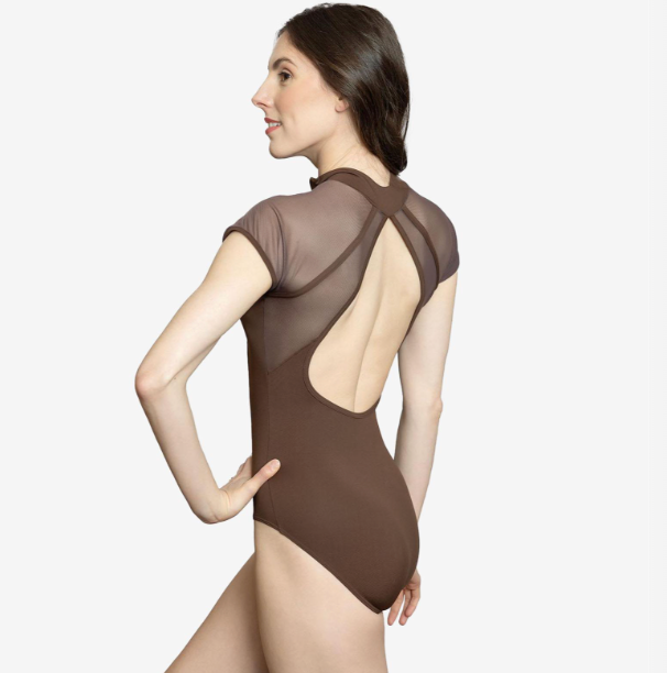 Adult short sleeve mock neck leotard with front zipper, sheer mesh shoulders and sleeves, and an open keyhole mesh back.