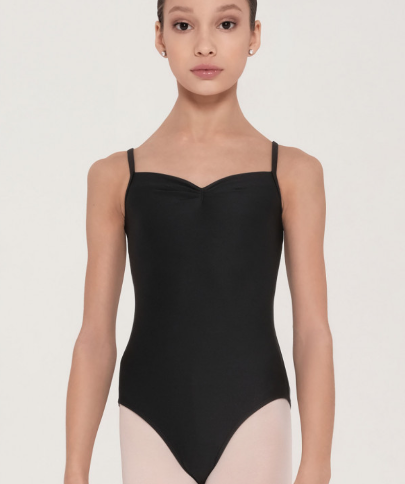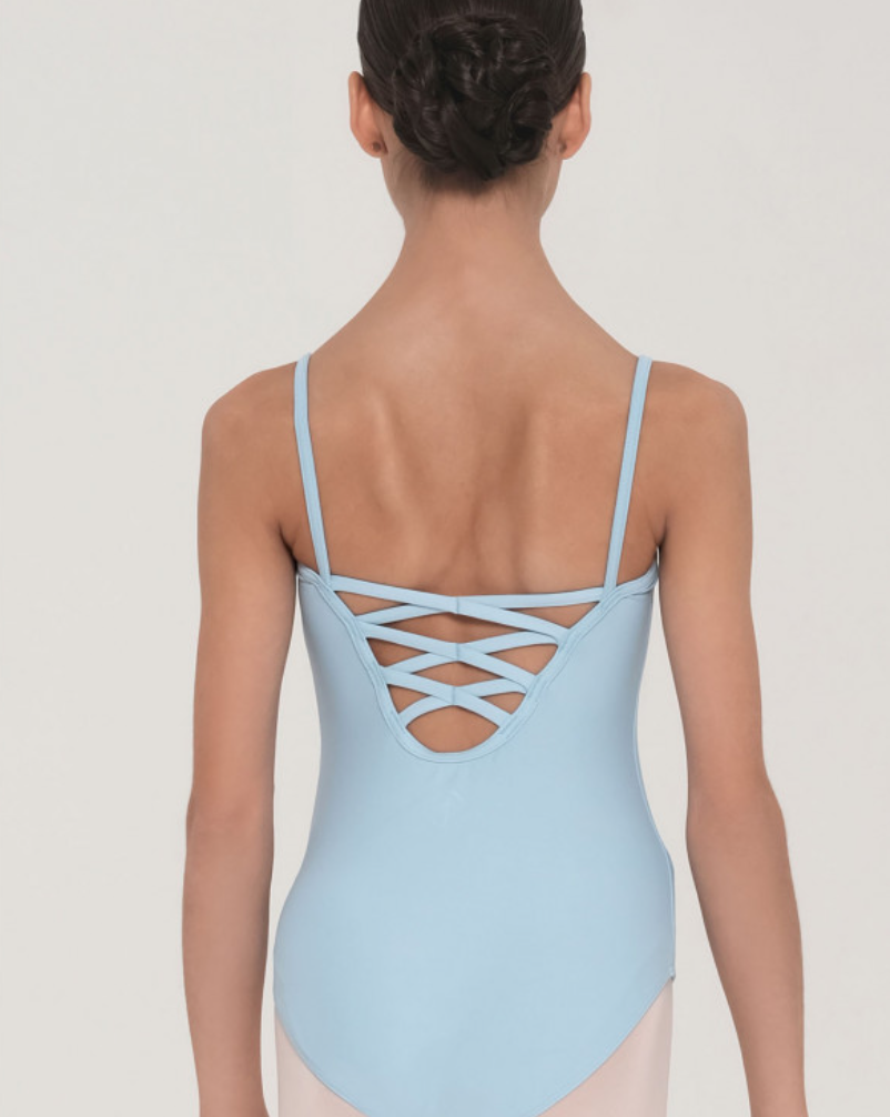 This microfiber leotard is minimalist in the front and more creative in the back.