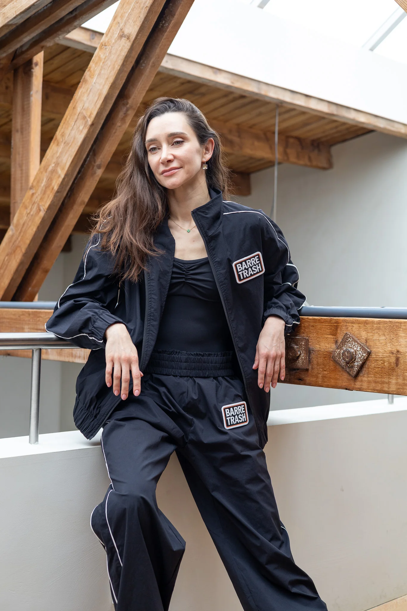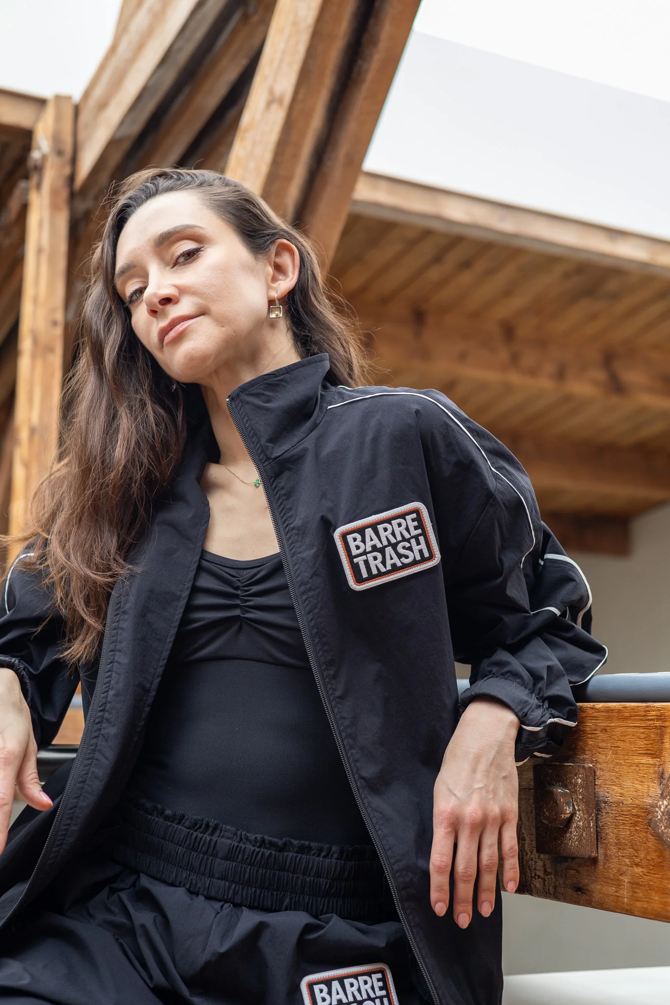 The new Barre Trash track suit jacket is unlined, with two side pockets, long arms, a front zipper closure and an embroidered “Barre Trash” patch on the chest.