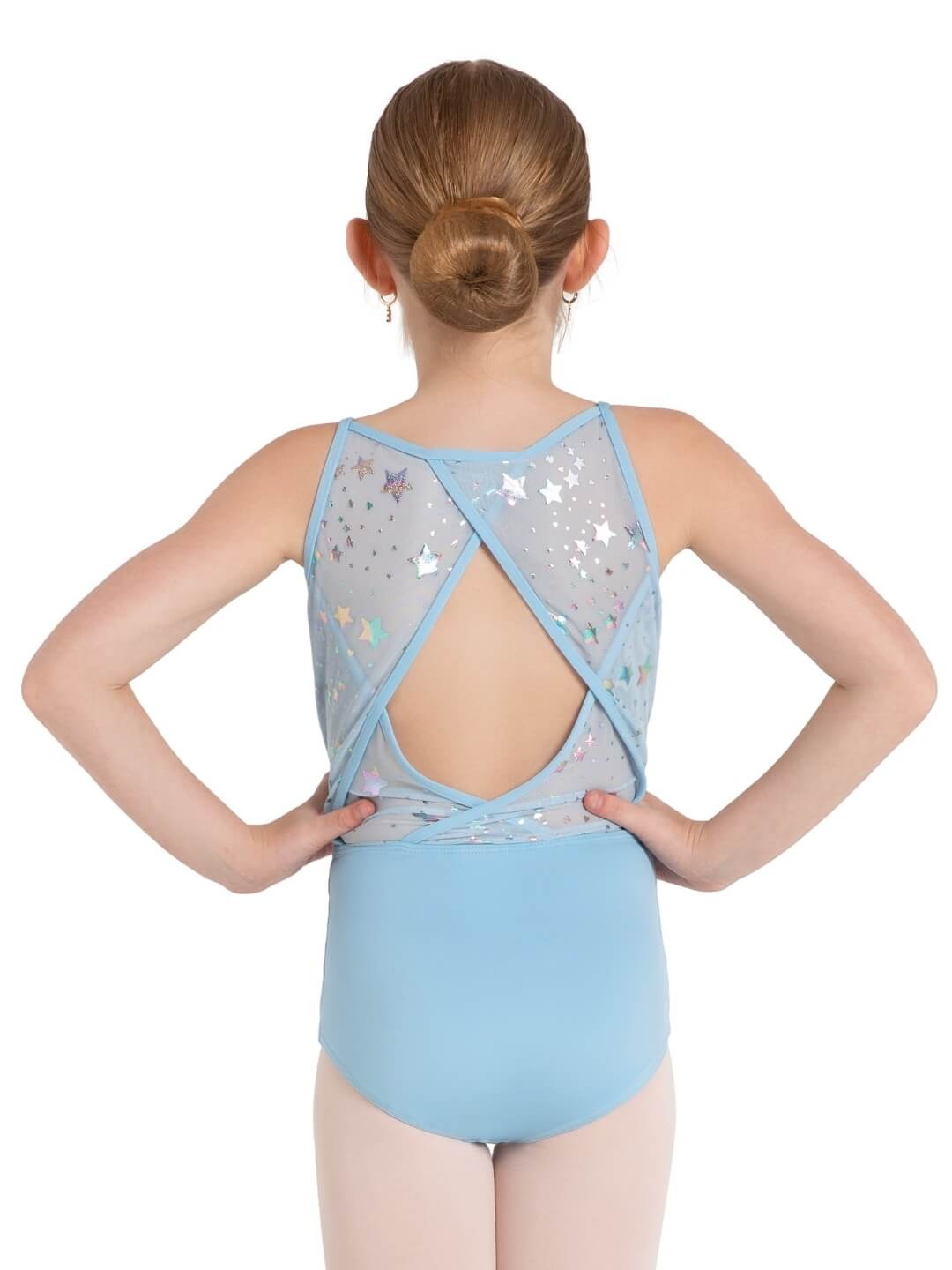 Blast into the spotlight in the Astro Diamond Back Leotard! Made from a soft polyester and spandex blend, this leotard offers a perfect balance of stretch and durability. The camisole design features a diamond back with a crisscross detail that will make every little dancer feel like a shooting star. Dyed-to-match front mesh yoke features a fun star pattern in Lavender, Light Blue, and Pink, while Black boasts a solid mesh for a classic and timeless look. Fully front-lined in all shades, ensuring full coverage and comfort during any class or performance.