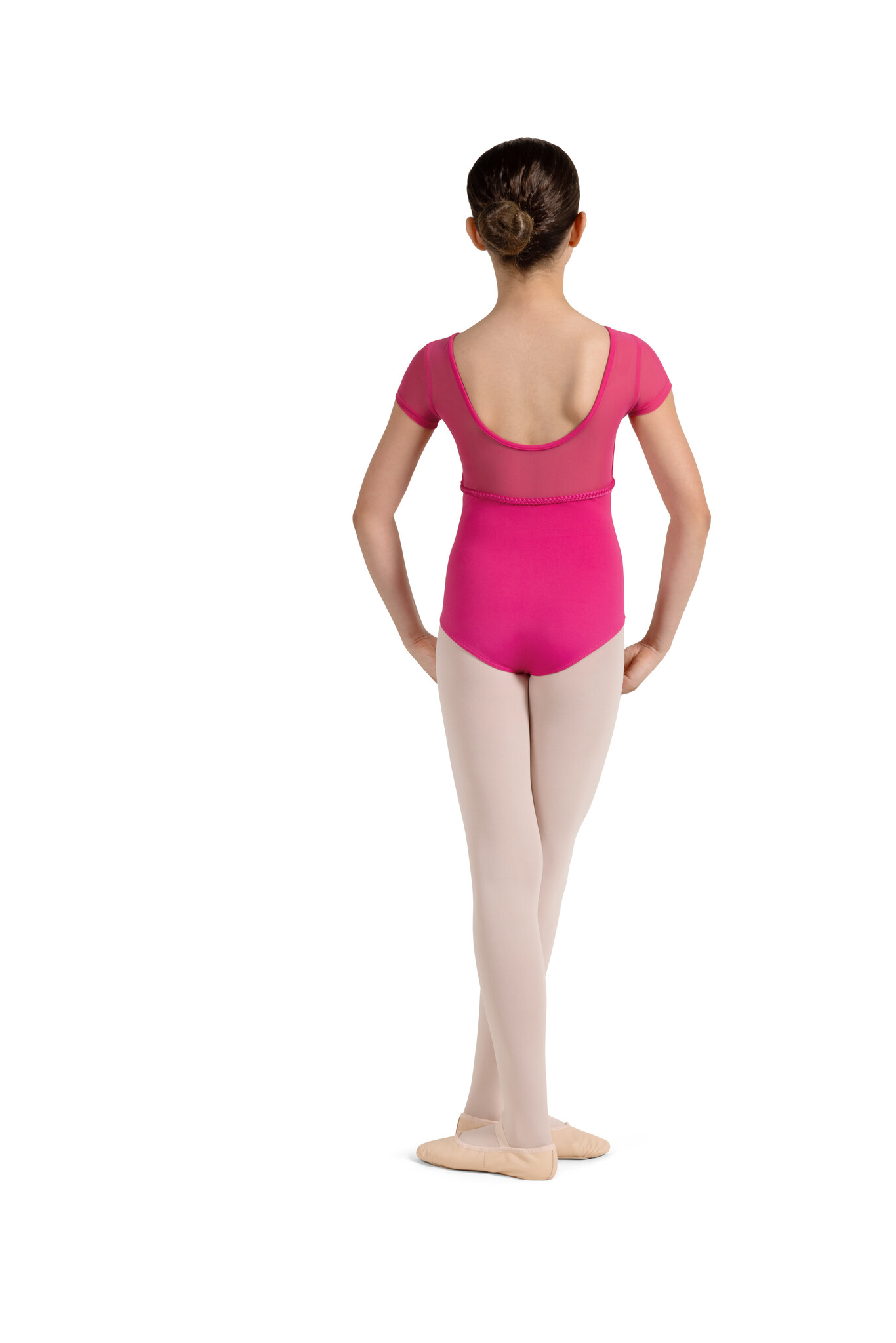 This cap sleeve leotard features mesh and braided accents to carry your style into the studio. Available in black and hot pink.