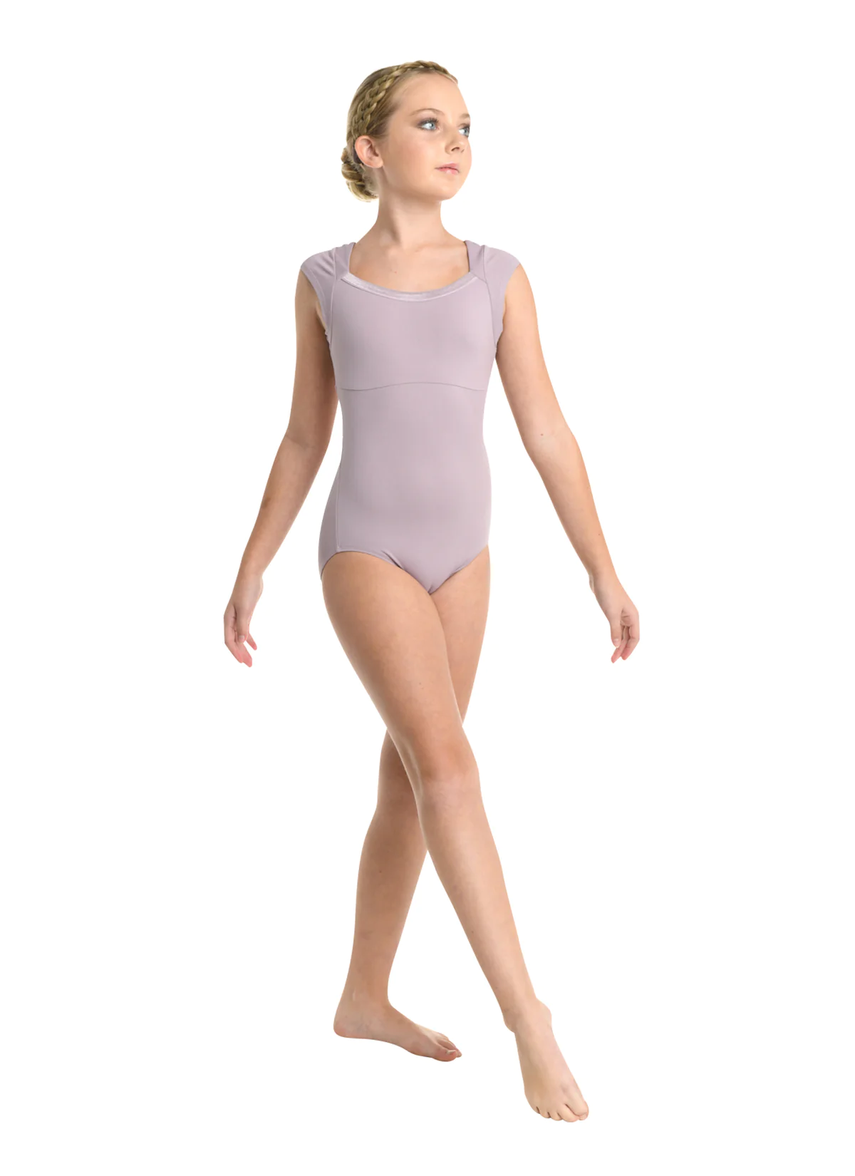 Micro-cap sleeve leotard with wide neck features satin elasticized binding, lace back with keyhole opening and centre back latch closure. Fully front lined. Nylon/Spandex.