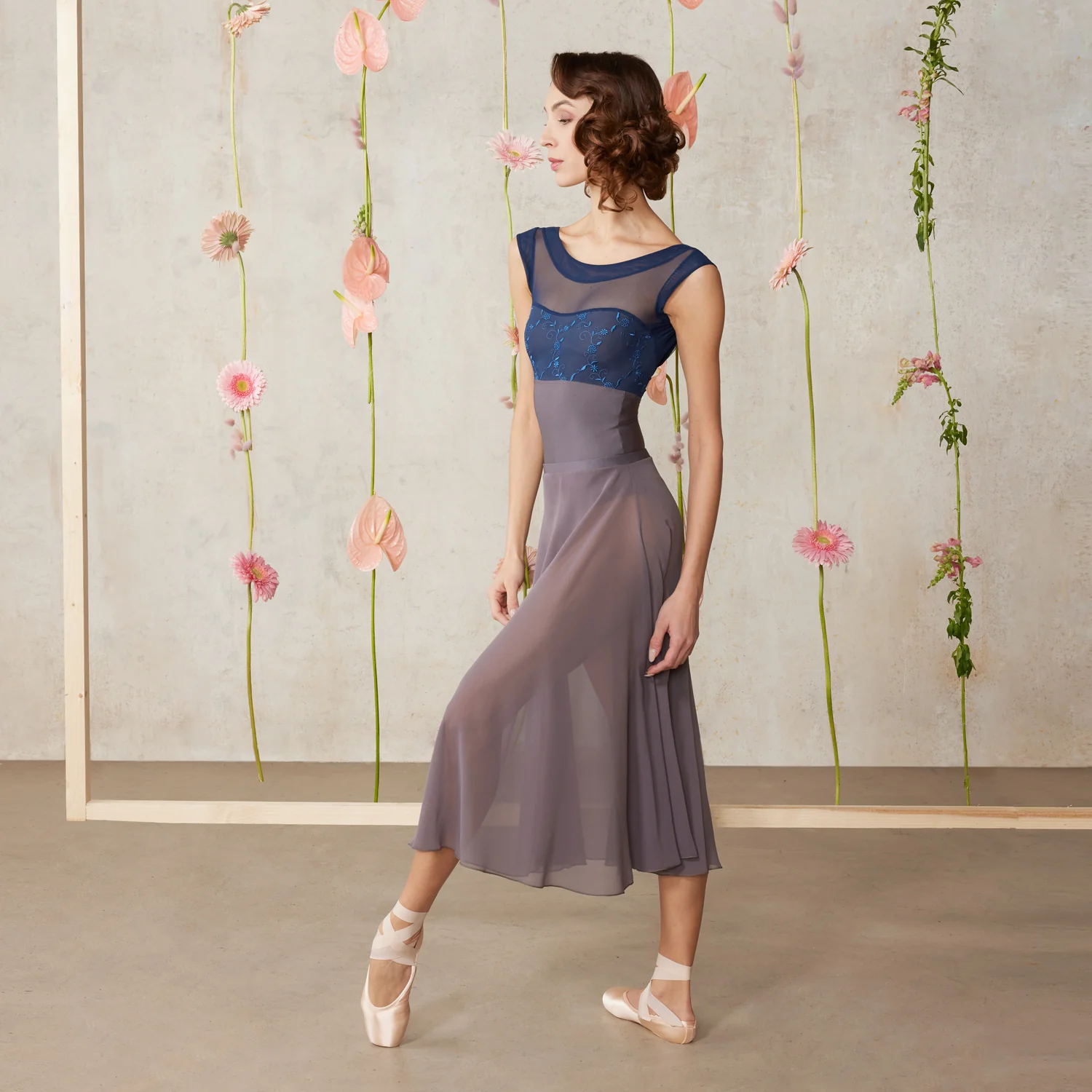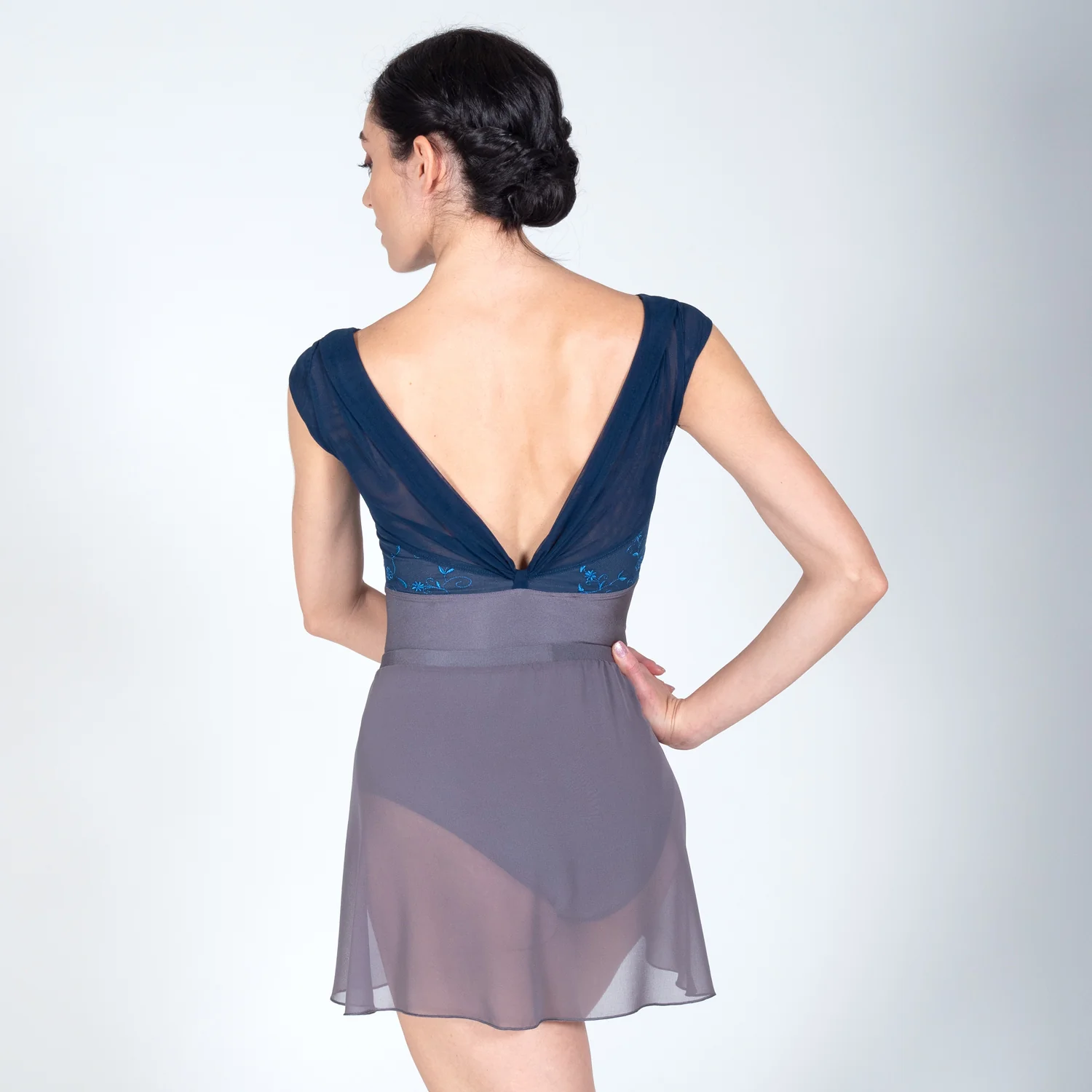 The DellaLo’ Diana leotard has a beautiful boat neckline and cap sleeves. The neckline border, made entirely of tulle, runs around the collarbones and ends in a V-shaped back with a sweetheart clasp. The sweetheart insert is made of embroidered DellaLo’ tulle for a precious touch that does compromise the elegance of the line.