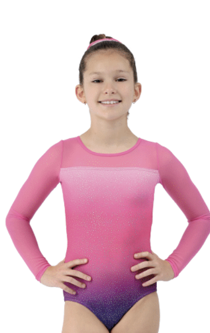 This long sleeve gymnastics leotard features purple to pink ombre pattern with sparkle accents and long mesh sleeves.