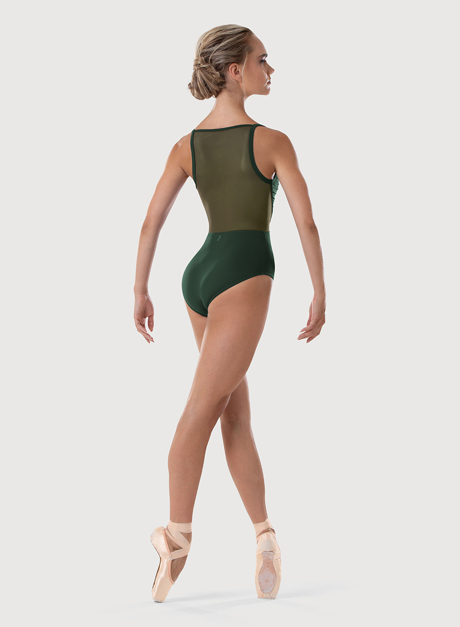 Transform your dance look with the Aurora camisole leotard from Bloch, designed with flattering front seaming that mimics the graceful boning of a tutu. The ruched mesh front adds a textured detail, while the full mesh back and side inserts enhance breathability and movement. Perfect for a polished yet comfortable performance, this leotard combines elegance with a unique twist.
