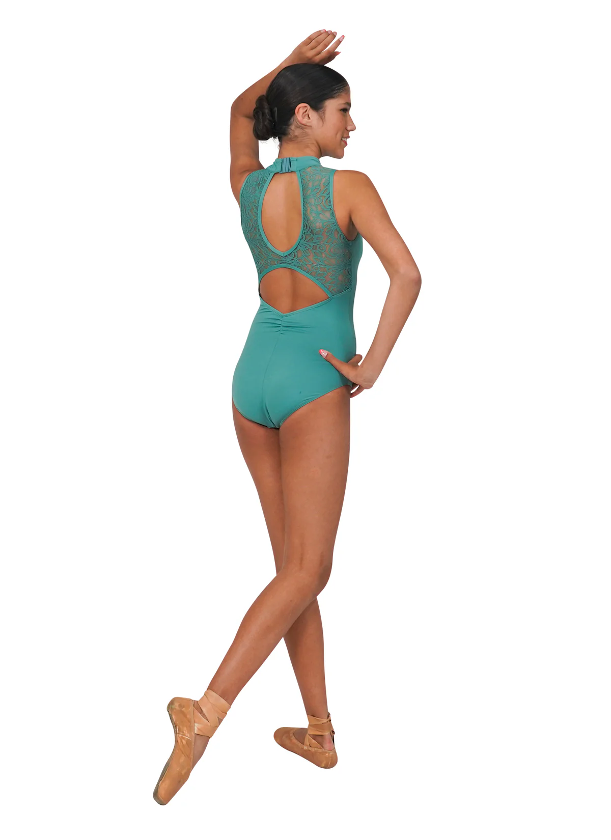 A leotard created by dancers, for dancers. This mock neck leotard features a simple front and a lace double keyhole back. The back features a soft and sturdy lace, a fixed pinch on lower back and clasp closure at back of neck. Shelf bra with removable cups.