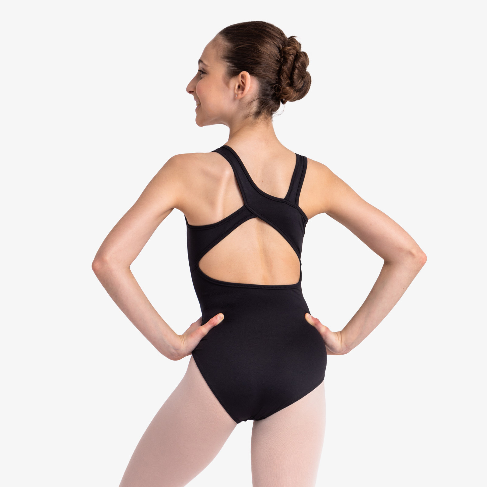 This children’s bodysuit has a basic tank style front but asymmetrical style back.
