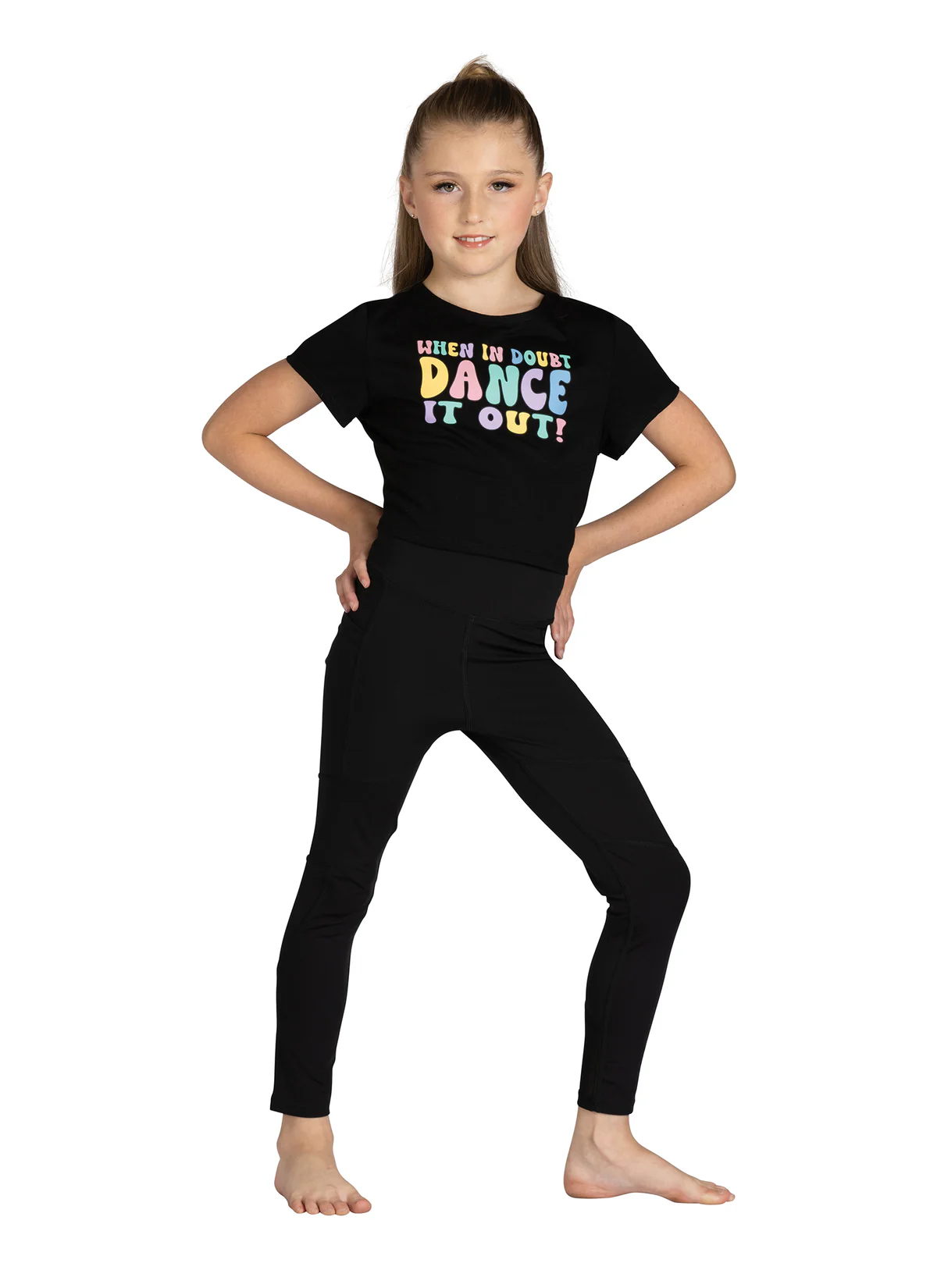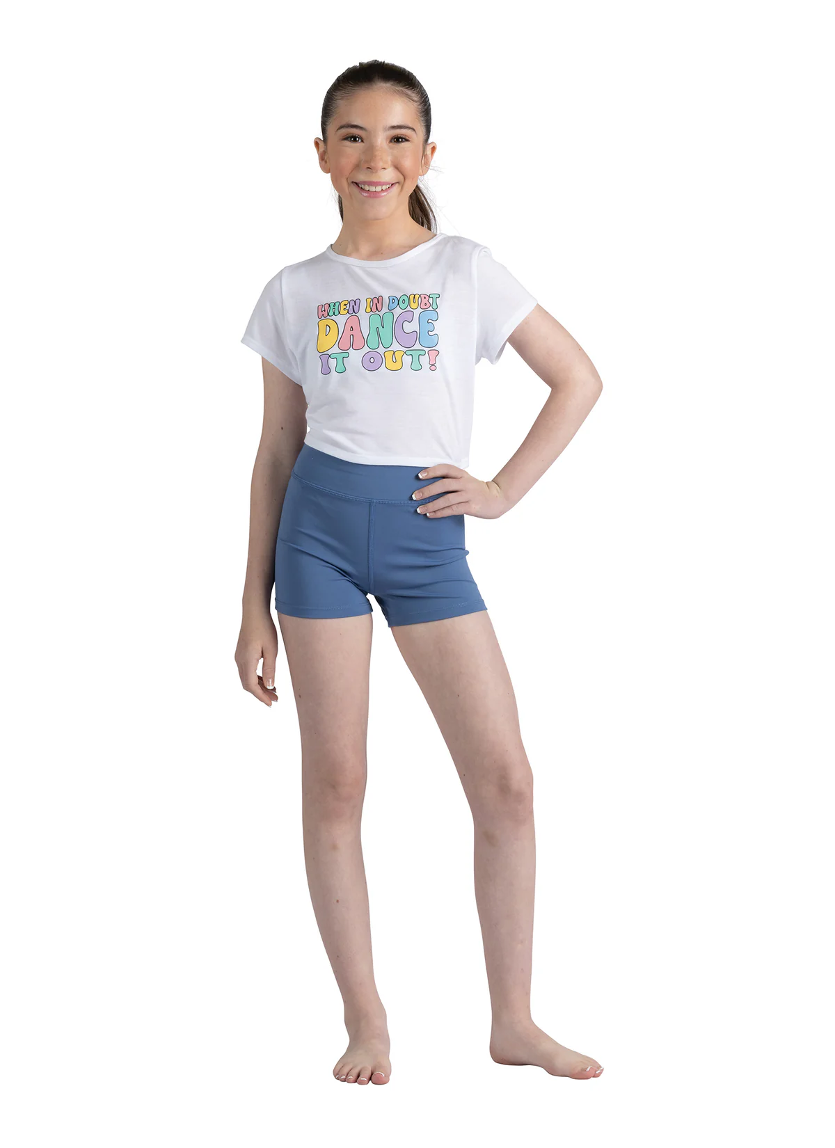 When In Doubt, Dance It Out! Crop t-shirt with open back and functional tie waist detail. Features front multi-Colour screen print. Printed on a very comfortable and soft tee.