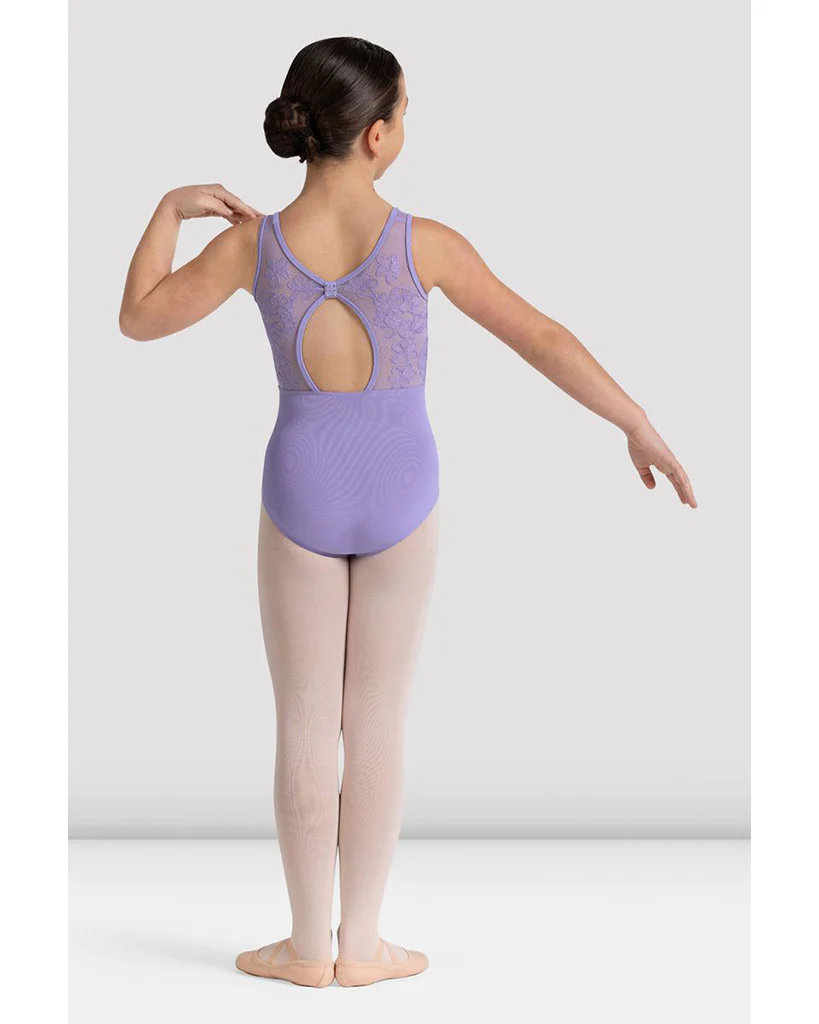 For an elegant design that moves with the body, this leotard features delicate floral embroidered mesh panels and tank straps with an open keyhole back.