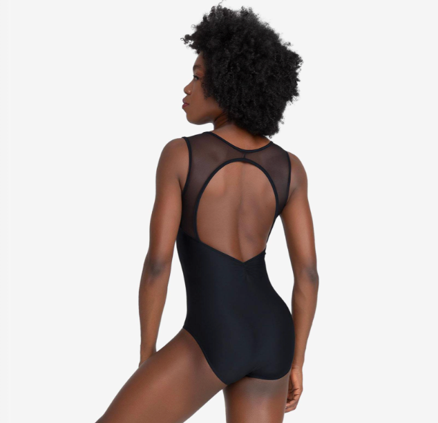 Youth tank leotard with mesh scoop neckline and full mesh back with keyhole opening.
