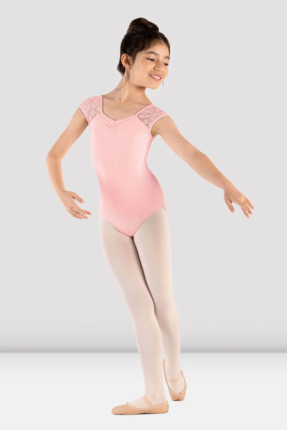 The Youth Mirella Majesty Cap Sleeve Leotard features dainty cap sleeves, a delicate daisy lace back, and sweetheart neck with pinch pleat detail. Bring charm and sparkle to every class with the Girls Majesty Lace Collection. Featuring delicate floral lace, vibrant eye-catching shades, and dazzling diamante accents, this collection combines adorable style with dance-ready functionality.